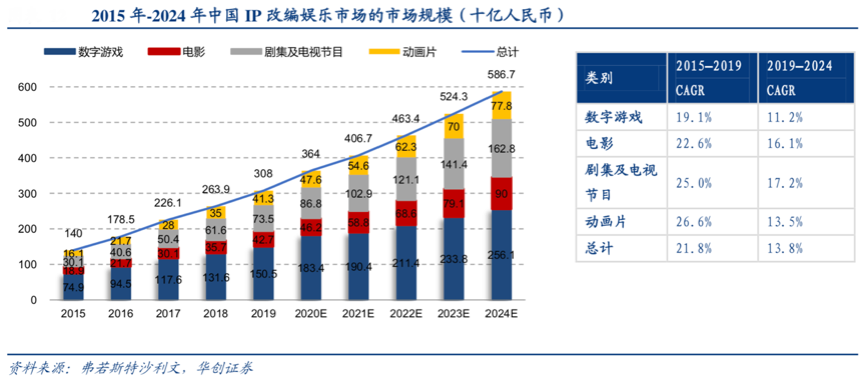 潮玩的商業(yè)化經(jīng)營范圍廣泛,其本質(zhì)在于品牌IP的商業(yè)化運作,品牌IP可以在數(shù)字游戲、電影、劇集、電視節(jié)目及動畫片等領(lǐng)域大規(guī)模應(yīng)用,極富商業(yè)價值及商業(yè)意義。根據(jù)弗若斯特沙利文、華創(chuàng)證券等綜合資訊顯示,中國IP改編娛樂市場在 2015 年至 2019 年間年復(fù)合增長率為 21.8%,預(yù)計于 2019 年達 3,080 億元,于 2024 年 達到5,867 億元,2019 年至 2024 年年復(fù)合增長率為 13.8%,市場規(guī)模持續(xù)擴大。