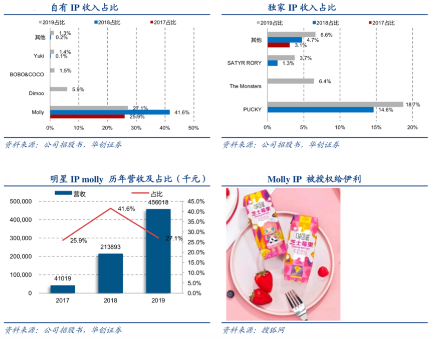 經(jīng)典案例:根據(jù)公司招股書、華創(chuàng)證券、搜狐網(wǎng)等綜合資訊顯示,泡泡瑪特的商業(yè)模式以品牌IP業(yè)務(wù)為核心,覆蓋潮流玩具全產(chǎn)業(yè)鏈,包括藝術(shù)家發(fā)掘、IP 運營、消費者觸達以及潮流玩具文化推廣。截至招股書披露日,泡泡瑪特共運營 85 個 IP,包括 12 個自有 IP、22 個獨家 IP 及 51 個非獨家 IP。頭部 IP 營收較高,2019 年,已有 4 個 IP 單獨產(chǎn)生收入超過了 1 億元人民幣,分別是 Molly,Dimoo,PUCKY,The Monsters;同時Molly的IP形象甚至都被授權(quán)給伊利、香港美心月餅以推廣產(chǎn)品。