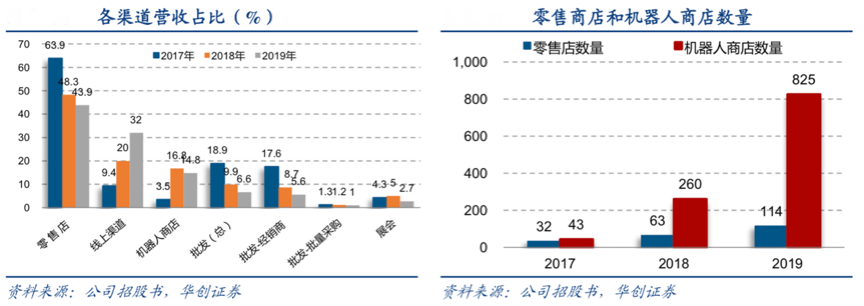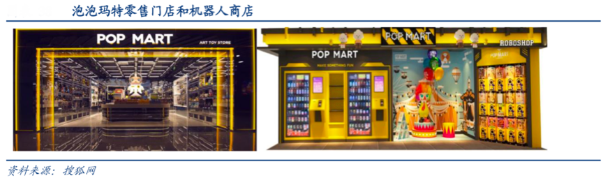 經(jīng)典案例:根據(jù)公司招股說明書、華創(chuàng)證券、搜狐網(wǎng)等綜合資訊顯示,截至2019年底,泡泡瑪特在中國33個一二線城市的主流商圈擁有114家直營零售店、全國 57 個城市擁有 825 家機器人商店。2018年單個機器人商店收入為33 萬,2019年單個機器人商店收入為 30 萬。除此之外,公司每年舉辦北京和上海國際潮 玩展以擴大影響力和收集新創(chuàng)意。批發(fā)渠道方面,目前國內(nèi)擁有 22 家經(jīng)銷商,海外有 19 家經(jīng)銷商。2019 年零售店收入占比為43.9%,線上渠道收入占比 32%,機器人商店收入占比為 14.8%。