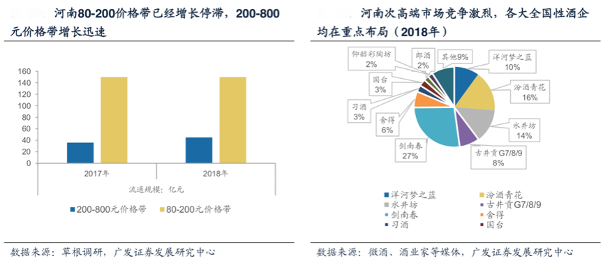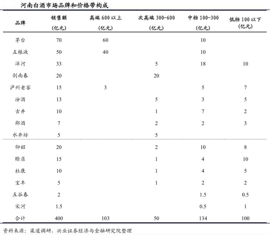 白酒品牌建設(shè)一直是各大白酒企業(yè)致勝市場的不二法寶,以價(jià)格檔次劃分品牌歸屬,在品牌歸屬洞察成長商機(jī),自然機(jī)會(huì)多多。據(jù)興業(yè)證券等綜合資訊顯示,河南白酒市場呈現(xiàn)明顯的“兩頭大、中間小”的特點(diǎn),高端合計(jì) 105 億左右,占比 26%, 其中茅臺(飛天及以上)60 億,五糧液 40 億,國窖 1573 在 3 億元左右。次高端 合計(jì) 50 億元,占比 15%,其中劍南春 20 億元,洋河夢系列 10 億元,汾酒青花系 列 5 億元,水井坊 5 億元,茅臺系的醬酒及五糧液、老窖的系列酒合計(jì)在 15 億元 左右,古井、舍得等合計(jì) 5 億元。中低端市場 234 億元,占比 59%,其中 50%為外 來酒,以洋河的海之藍(lán)、天之藍(lán)、汾酒的玻汾、以及茅五瀘低端的系列酒為主; 本土酒企占剩下的50%即全省規(guī)模的 30%左右,其中仰韶、賒店、杜康為收入規(guī)模 在 10 億元以上的本土品牌。