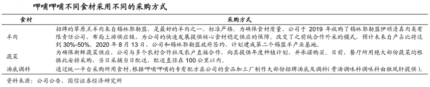 經(jīng)典案例:根據(jù)公司公告、國信證券經(jīng)濟(jì)研究所等綜合資訊表明,呷哺呷哺主打產(chǎn)品,定位“好吃不貴”,所以其對食材、供應(yīng)鏈和菜品創(chuàng)新能力要求很高。呷哺呷哺通過統(tǒng)一的平臺,進(jìn)行全球化的采購。自采+外采保證食材供應(yīng),收購錫盟肉類公司布局產(chǎn)業(yè)鏈上游。截至 2019 年,其合作供應(yīng)商有 591 個。核心食材自己把控生產(chǎn),2019 年其收購了錫林郭勒盟伊順清真肉類有限責(zé)任公司,布局上游供應(yīng)鏈,為公司的快速發(fā)展提供核心食材穩(wěn)定供應(yīng)的保障。