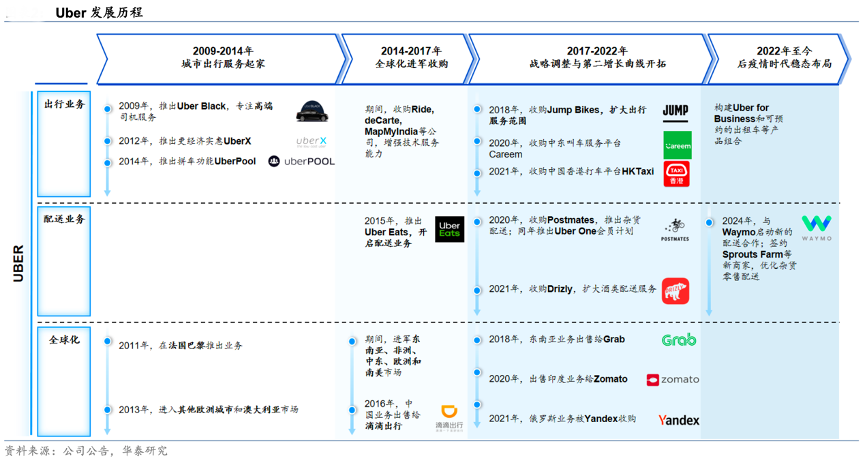經(jīng)典案例:根據(jù)公司公告、華泰研究等綜合資訊表明,Uber出行服務(wù)起家,縱橫拓展成為全球領(lǐng)先的移動(dòng)科技平臺。