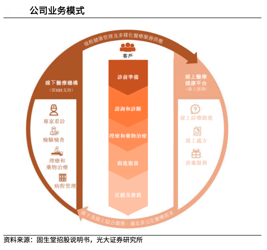 經(jīng)典案例:根據(jù)固生堂招股說(shuō)明書(shū)、光大證券研究所等綜合資訊表明,固生堂以基礎(chǔ)醫(yī)療為重心,建立了線上醫(yī)療健康平臺(tái)與線下醫(yī)療機(jī)構(gòu)相結(jié)合的中醫(yī)平臺(tái),并將中醫(yī)和西醫(yī)結(jié)合,為客戶提供貫穿疾病診療和醫(yī)療健康管理全過(guò)程的全面醫(yī)療健康解決方案。