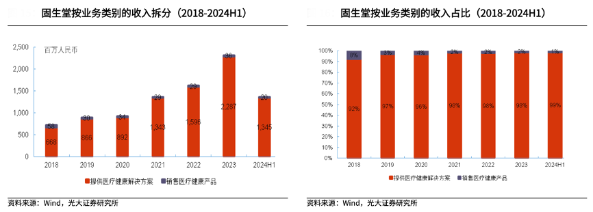 經(jīng)典案例:根據(jù)wind、光大證券研究所等綜合資訊表明,固生堂主要業(yè)務(wù)分為醫(yī)療健康解決方案和銷(xiāo)售醫(yī)療健康產(chǎn)品兩大板塊,其中醫(yī)療健康解決方案為收入主要來(lái)源。醫(yī)療健康解決方案服務(wù)包括提供診前準(zhǔn)備、優(yōu)質(zhì)的問(wèn)診與診斷、理療、中醫(yī)處方及煎藥服務(wù)。提供醫(yī)療健康解決方案的收入占比由 2018 年的 92%提升至 2024H1 的 99%,呈逐年提升趨勢(shì)。
