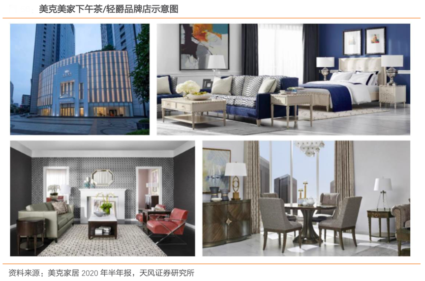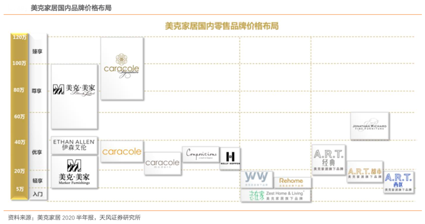經(jīng)典案例:根據(jù)美克家居2020年半年報(bào)、天風(fēng)證券研究所等綜合資訊表明,美克家居品牌覆蓋價(jià)格帶寬廣,滿足不同經(jīng)濟(jì)能力消費(fèi)者需求。其將旗下品牌分為頂級(jí)、高級(jí)、中級(jí)下/中/下 5 個(gè)等級(jí),其中 Caracole Signature、美克美家 “Black Label”、伊森艾倫、 Caracole、Compositions、美克美家“Market Furnishings”品牌由美克美家自營渠道經(jīng)銷,覆蓋從 12 萬到 120 萬的價(jià)格帶,客戶群定位中高端收入人群;A.R.T.經(jīng)典、A.R.T.都市與 A.R.T.西區(qū)品牌分別覆蓋 15 萬到 40 萬、10 萬到 30 萬與 5 萬到 25 萬的價(jià)格帶,分別面向 高端與中等收入人群;另有Rehome、YVVY、Jonathan Richard 填補(bǔ) 10 萬到 15 萬、10 萬 到 20 萬、40 萬到 60 萬的差異區(qū)間,定位愿意為原創(chuàng)設(shè)計(jì)買單的群體;最后是恣在家 Zest Home 覆蓋了 3 萬到 10 萬的消費(fèi)者需求,定位中年輕人。