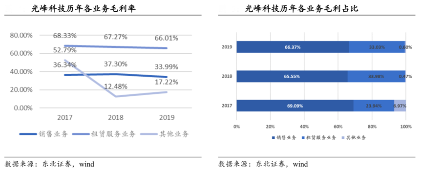 經(jīng)典案例:根據(jù)東北證券、wind、公司公告等綜合資訊表明,光峰科技2017-2019 年銷售業(yè)務(wù)毛利率分別為36.34%、37.30%和 33.99%,租賃業(yè)務(wù)毛利率保持高水平, 分別為 68.33%、67.27%和 66.01%,主要是由于公司作為激光顯示行業(yè)領(lǐng)軍企業(yè),產(chǎn)品技術(shù)附加值高,具有較強(qiáng)定價(jià)能力。而從毛利潤(rùn)規(guī)模占比來看,銷售業(yè)務(wù)是主要 的利潤(rùn)來源,2019 年占比為 66.37%;租賃服務(wù)占比呈上升趨勢(shì),由 2017 年的 23.94% 提升至 33.03%。