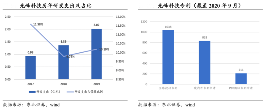 經(jīng)典案例:根據(jù)東北證券、wind等綜合資訊表明,光峰科技2017 年、2018 年和 2019 年研發(fā)費用分別為 9330.16 萬元、13573.05 萬元及 20169.78 萬元,研發(fā)支出逐年增加;截至 2020 年 9 月 30 日,公司累計在全球范圍內(nèi)獲得授權(quán)專利 1038 項,境內(nèi)外專利申請 832 項,ALPD®技術(shù)架構(gòu)經(jīng)過四代升級研發(fā),每代架構(gòu)平臺相對于上一代平臺都有著全面的性能提升,保持對同行業(yè)跟隨者和競爭者的技術(shù)性能優(yōu)勢。