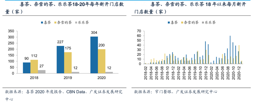 經(jīng)典案例:根據(jù)喜茶2020年度報(bào)告、CBN Data、窄門(mén)餐眼、廣發(fā)證券發(fā)展研究中心等綜合資訊表明,在經(jīng)歷了2015-17年新式茶飲消費(fèi)者教育的階段后,喜茶和奈雪的茶迅速完成品牌認(rèn)知和忠誠(chéng)度的積累,在資本助力下開(kāi)啟了快速開(kāi)店的階段,2018年-20年喜茶新開(kāi)門(mén)店90 家、227家、304家,截止21年1月,奈雪的茶在全國(guó) 共有513家門(mén)店。