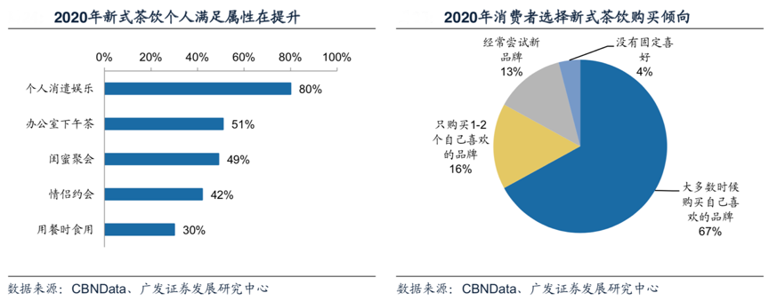 經(jīng)典案例:根據(jù)CBNData、廣發(fā)證券發(fā)展研究中心等綜合資訊表明,根據(jù)大眾點(diǎn)評(píng)2019年數(shù)據(jù),在不同餐飲品類(lèi)中,飲品店點(diǎn)評(píng)熱度僅次于火鍋。根據(jù)CBNData,2020年消費(fèi)者偏好的消費(fèi)場(chǎng)景中,個(gè)人消遣娛樂(lè)達(dá)到 80%,茶飲的個(gè)人消費(fèi)屬性有所強(qiáng)化。此外下午茶、閨蜜聚會(huì)、情侶約會(huì)、用餐也是茶飲消費(fèi)的主要場(chǎng)景。消費(fèi)者對(duì)品牌忠誠(chéng)度在不斷提升,2020年大多數(shù)時(shí)候購(gòu)買(mǎi) 自己喜歡的品牌的消費(fèi)者占67%,只購(gòu)買(mǎi)自己喜歡的1-2個(gè)品牌的消費(fèi)者占16%。