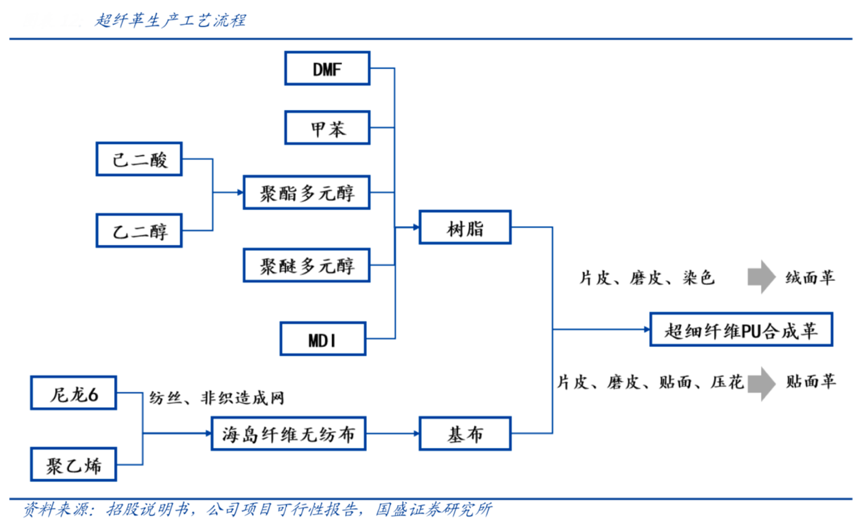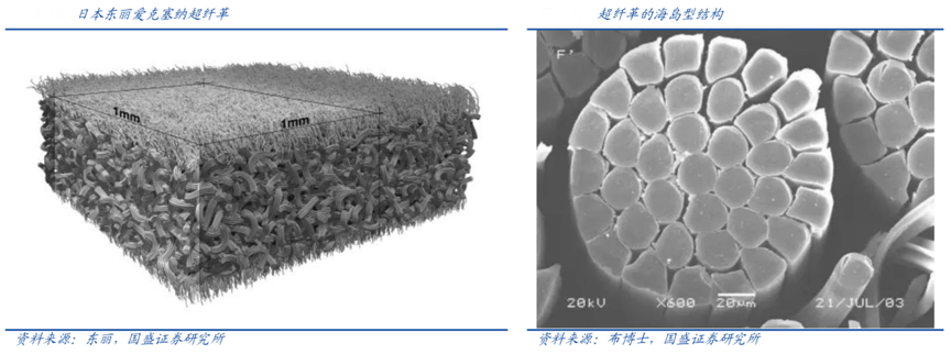 經(jīng)典案例:根據(jù)東麗、布博士、國(guó)盛證券研究所等綜合資訊表明,超纖革的關(guān)鍵工序包括海島纖維紡絲、非織布制造、開(kāi)纖制造超纖基布和聚氨酯浸漬等工序。其中,海島超纖維加工技術(shù)是基布制造的核心。由于海島型超細(xì)纖維和天然皮革的超細(xì)膠原纖維結(jié)構(gòu)極為相似,使其在各種性能上能與天然皮革媲美,成為天然皮革的最佳替代品。