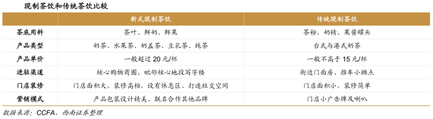 經(jīng)典案例:根據(jù)CCFA、西南證券等綜合資訊表明,與傳統(tǒng)茶飲相比,新式茶飲的“新”主要體現(xiàn)在新鮮食材、新技術(shù)、新視角呈現(xiàn)品牌價(jià)值三個(gè)方面。一是新式茶飲使用新鮮品質(zhì)食材,用水果、原葉茶、奶蓋及牛乳替代果醬、茶粉、奶精,產(chǎn)品客單價(jià)也較高;二是加工制售過程中重視數(shù)字化和新技術(shù)應(yīng)用;三是通過大店、品牌聯(lián)名等新視角呈現(xiàn)品牌價(jià)值,重視顧客的體驗(yàn)和品牌認(rèn)同感。