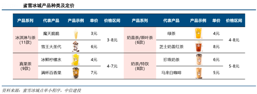 經(jīng)典案例:根據(jù)窄門餐眼、中信建投等綜合資訊表明,蜜雪冰城定位大眾消費(fèi),性價(jià)比高。其主打冰淇淋與茶、奶茶&特飲、奶蓋茶&原葉茶、真果茶 4 大系 列產(chǎn)品。2020 年 4 月,在我國(guó)頭部奶茶品牌宣布漲價(jià)并邁入了“30 元時(shí)代”之際,蜜雪冰城仍將產(chǎn)品定價(jià)在 3 元到 8 元之間,堅(jiān)持為每一位普通消費(fèi)者提供物超所值的產(chǎn)品和服務(wù)。