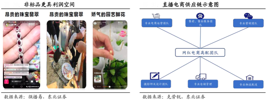 直接電商是前端,強(qiáng)大“供應(yīng)鏈系統(tǒng)”是重要支撐。“起勢(shì)靠流量,成敗看供應(yīng)鏈”,完善的直播電商需要“專(zhuān)業(yè)供應(yīng)鏈支持”。精選商品,退換貨管理、柔性供應(yīng)鏈能力、倉(cāng)儲(chǔ)物流管理等才是增加用戶(hù)滿(mǎn)意度,提升轉(zhuǎn)化率和復(fù)購(gòu)率的核心。標(biāo)準(zhǔn)品以“規(guī)模化生產(chǎn)分銷(xiāo)”為導(dǎo)向,側(cè)重“以量取勝”,而非標(biāo)品則以“價(jià)值化行銷(xiāo)”為導(dǎo)向,側(cè)重“以質(zhì)取勝”,鎖定高品質(zhì)消費(fèi)人群做“圈子營(yíng)銷(xiāo)”。根據(jù)微播易、東北證券 、克勞銳等綜合資訊表明,非標(biāo)品更具利潤(rùn)空間,直播電商供應(yīng)鏈價(jià)值突出。