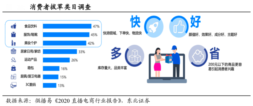 直播電商近兩年內(nèi)剛剛興起,其有自己的適合品類(lèi)及適配人群,基于品類(lèi)特質(zhì)做“直播商品篩選”,強(qiáng)化產(chǎn)品的高效組合,是直播電商新零售競(jìng)爭(zhēng)取勝的“不二法則”。根據(jù)微播易、東北證券等綜合資訊表明,當(dāng)前消費(fèi)者在直播電商中的購(gòu)物興趣主要集中在快消品上,以食品飲料、服裝、美妝個(gè)護(hù)等品類(lèi)為主,核心追求直播電商帶來(lái)的性?xún)r(jià)比。淘寶直播、抖音、快手等主 要電商直播平臺(tái)帶貨類(lèi)目除淘寶擁有如珠寶等基于平臺(tái)信用價(jià)值、場(chǎng)景價(jià)值的客單 類(lèi)目外,抖音和快手主要品類(lèi)主要還是集中在性?xún)r(jià)比高的實(shí)用型產(chǎn)品,客單價(jià)分為在 0-50 元和 0-200 元區(qū)間。