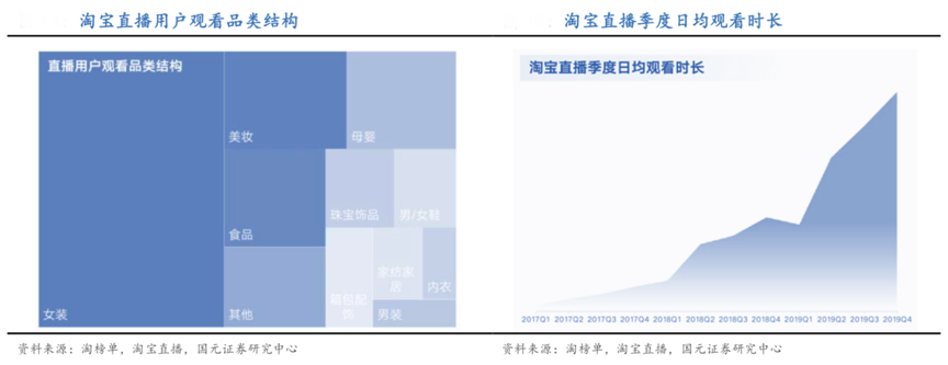 直播電商初步擺脫了“單一品類”的依賴,多品類直播、多場景直播等成為淘寶直播品牌策劃營銷的典型特色。根據(jù)淘榜單、淘寶直播和國元證券研究中心等綜合資訊表 明,2019年末淘寶直播每天可購買商品數(shù)量同比增長190%, 覆蓋淘寶天貓的絕大部分品類,其中女裝、美妝、母嬰、食品為最熱門的品類。直播內(nèi)容場景日益豐富,截至2019年末,消費(fèi)者每天可觀看的直播內(nèi)容時(shí)長超 35 萬小時(shí),直場景也由直播間擴(kuò)展至工廠、田間、檔口、商場、街頭、市場等。