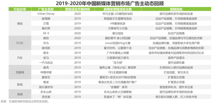 根據(jù)艾瑞咨詢《2020年中國(guó)新媒體營(yíng)銷(xiāo)策略白皮書(shū)》等綜合資料顯示,如美妝、IT/3C、影視等行業(yè)的廣告主,紛紛加強(qiáng)對(duì)新媒體營(yíng)銷(xiāo)模式的采用和布局,從提升品牌知名度、拉動(dòng)產(chǎn)品銷(xiāo)售到宣傳品牌差異化特征等的需求,均通過(guò)品效合一的新媒體整合營(yíng)銷(xiāo)策劃創(chuàng)新得以實(shí)現(xiàn)。