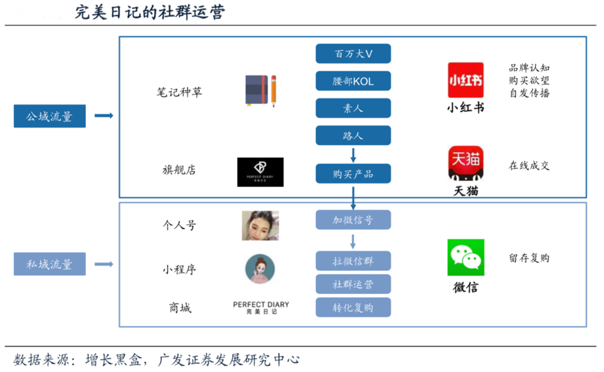 經(jīng)典案例:根據(jù)增長(zhǎng)黑盒、廣發(fā)證券發(fā)展研究中心等綜合資訊表明,在小紅書(shū)MAU增長(zhǎng)趨緩之后,完美日記開(kāi)始挖掘抖音、淘寶直播、B站等新渠道的 流量?jī)r(jià)值;公域流量增長(zhǎng)放緩之后開(kāi)始加速私域流量社群運(yùn)營(yíng)。2018年下半年開(kāi)始, 完美日記開(kāi)始增加其他流量平臺(tái)的投放,2018年年底品牌在淘寶直播的轉(zhuǎn)化就超過(guò) 了在小紅書(shū)的轉(zhuǎn)化。