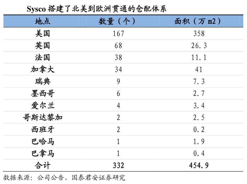 經(jīng)典案例:根據(jù)公司公告、國泰君安證券研究等綜合資訊表明,Sysco自建倉儲(chǔ)物流設(shè)施,打造貫通歐洲、北美的供應(yīng)鏈體系,服務(wù)客戶數(shù)超 60 萬。Sysco 擁有面積達(dá) 4896 萬平方英尺的 332 個(gè)配送中心,1.4 萬輛 物流運(yùn)輸車輛。