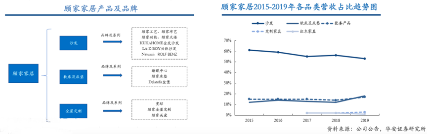 經(jīng)典案例:根據(jù)公司公告、華安證券研究所等綜合資訊表明,顧家家居是軟體家具行業(yè)龍頭,創(chuàng)立40載為全球家庭提供健康、舒適、環(huán)保的客廳及臥室家居產(chǎn)品,公司品類擴張之路順暢,沙發(fā)的營業(yè)收入占比從2015年的61%下降至 2019年的53%,而軟床及床墊的營收占比從2015年的12%提升至2019年的18%。配套產(chǎn)品2019年的營收占比也達到 17%。
