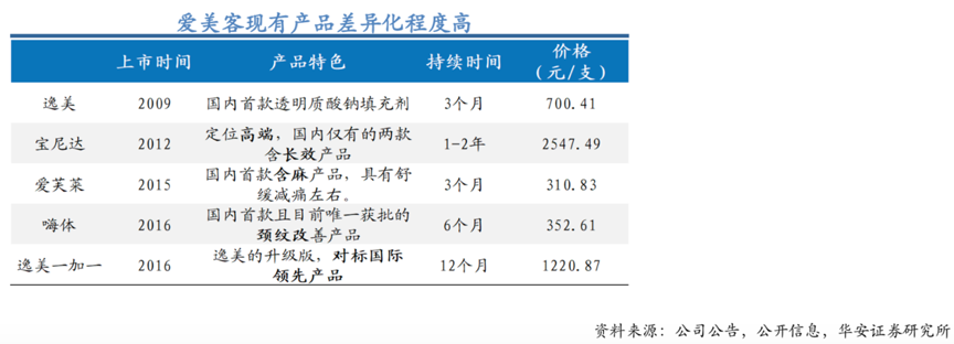 經(jīng)典案例:根據(jù)公司公告、公開信息和華安證券研究所等綜合資訊表明,愛美客專注于玻尿酸產(chǎn)品生產(chǎn),其目前共有6款玻尿酸系列產(chǎn)品在售,產(chǎn)品差異化程度較高,嗨體作為目前國內唯 一獲批的頸紋改善產(chǎn)品,考慮到牌照獲批時間,預計未來5年內公司能夠獨占這一細分賽道。