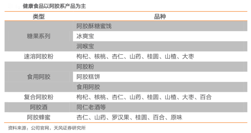 經(jīng)典案例:根據(jù)公司官網(wǎng)、天風(fēng)證券研究所等綜合資訊表明,同仁堂公司健康食品的開(kāi)發(fā)以阿膠系產(chǎn)品為主,主張“藥食同源”理念,包括了糖果系列、速溶阿膠粉、食用阿膠、阿膠酒、復(fù)合阿膠粉和阿膠蜂蜜等多種健康食品。