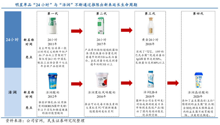 經(jīng)典案例:根據(jù)公司官網(wǎng)、民生證券研究院等綜合資訊表明,2012年,新希望乳業(yè)推出活潤產(chǎn)品,專注于消化和腸道健康的強(qiáng)功能型酸奶。2018年,更新至活潤 LB-8,填補(bǔ)了國 內(nèi)高端功能乳飲品的空缺。 2020年,主打“嚼得到的益生菌”,利用 3D 包埋技術(shù)在酸奶中添加晶球。
