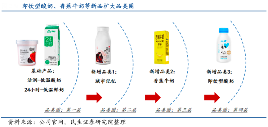 經(jīng)典案例:根據(jù)公司官網(wǎng)、民生證券研究院等綜合資訊表明,新希望乳業(yè)以新品迭代擴(kuò)大品類圈。“城市記憶”以獨(dú)特的插畫承載每個(gè)城市的伴隨當(dāng)?shù)叵M(fèi)者成長的印記,“香蕉牛奶”以明黃色的包裝、香蕉與牛奶混搭的口感與風(fēng)味,“初心酸奶”捕捉到瓶裝酸奶即飲消費(fèi)的趨勢,推出面向年輕消費(fèi)群體的,采用零添加純凈配方、使用100%純鮮牛乳、無食品添加劑,真正實(shí)現(xiàn)零添加酸奶。