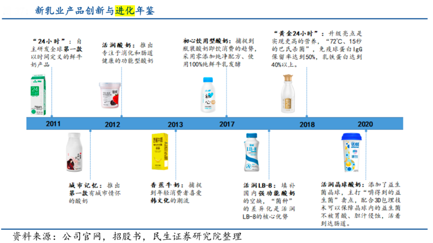 經(jīng)典案例:根據(jù)公司官網(wǎng)、招股書、民生證券研究院等綜合資訊表明,2011 年以來,新希望乳業(yè)自主研發(fā)第一款以時(shí)間定義的鮮奶“24 小時(shí)”,推出第一款主打城市情懷的酸奶,推出第一款即飲型瓶裝酸奶。截止 2020 年,公司已形成豐富產(chǎn)品矩陣:包括 9 大類產(chǎn) 品、80 個(gè)主要產(chǎn)品品牌、約 300 個(gè)產(chǎn)品規(guī)格,多于同為低溫乳企的光明、三元等。