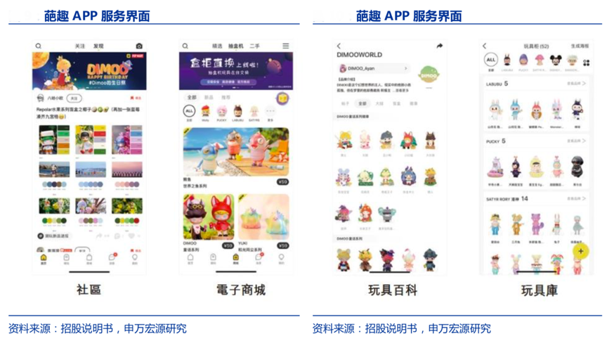 經(jīng)典案例:根據(jù)招股說明書、申萬宏源研究等綜合資訊表明,泡泡瑪特自主開發(fā)了國內(nèi)最專業(yè)的潮流玩具社交平臺——葩趣 APP,已經(jīng)覆蓋超過 540 個潮玩品牌,平臺上可以看到粉絲發(fā)帖分 享和展示自己的收藏、設(shè)計師發(fā)布和出售自己的新作品,除了盲盒和手辦,還有關(guān)于潮玩的攝影、壁紙和周邊,還有“改娃”“轉(zhuǎn)娃”“換娃”等新的互動方式。