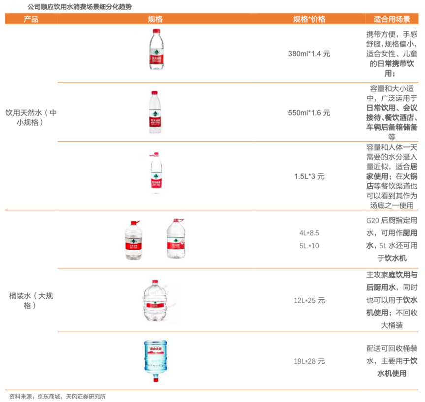 經典案例:根據(jù)京東商城、天風證券研究所等綜合資訊表明,隨著居民健康意識的逐漸增強以及對高生活品質的追求,廚用水、日飲水等家庭場景用水質量得到越來越多消費者的關注;農夫山泉順應飲用水消費場景細分化趨勢,產品涵蓋了各種380ml、550ml、1500ml、4L、5L、12L、19L等多種規(guī)格,家用消費、商用消費及小規(guī)格攜帶消費等多種消費場景基本已經涵蓋,“產品全消費場景價值”突出。