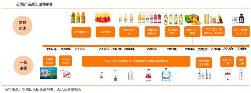 經典案例:根據(jù)農夫山泉招股說明書、天風證券研究所等綜合資訊表明,2012 年-2019年,農夫山泉連續(xù)八年保持中國包裝飲用水市場占有率第一,以2019 年零售額計,農夫山泉在茶飲料、功能飲料及果汁飲料的市場份額均居中國市場前三位,其已經形成多元化產品矩陣,除飲用水外,已經布局即飲茶、功能飲料、果汁、植物蛋白、咖啡類等多品類成長矩陣。
