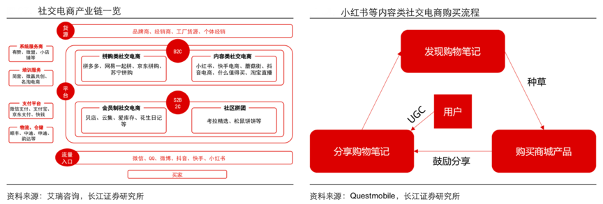 經(jīng)典案例:根據(jù)艾瑞咨詢(xún)、Questmobile、長(zhǎng)江證券研究所等綜合資訊表明,內(nèi)容型社交電商以意見(jiàn)領(lǐng)袖的口碑為流量入口,通過(guò)圖文帖子、直播、短視頻等豐富的形式,通過(guò)購(gòu)物攻略、分享導(dǎo)購(gòu)等與購(gòu)物相關(guān)的內(nèi)容社區(qū)吸引用戶(hù),用戶(hù)在觀看這些內(nèi)容時(shí)可以直接在平臺(tái)內(nèi)或通過(guò)鏈接跳轉(zhuǎn)到電商平臺(tái)進(jìn)行購(gòu)買(mǎi)。