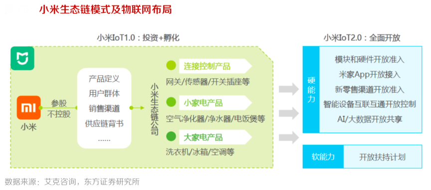 經(jīng)典案例:根據(jù)艾克咨詢、東方證券研究所等綜合資訊表明,2013年,小米開始布局 IOT 業(yè)務(wù),采用投資+孵化生態(tài)鏈公司的策略,2014-2016 年,小米投資了 77 家生態(tài)鏈公司,其中包括華米、藍米、碩米、智米、田米、純米等一系列重量級公司,截至到 2019 年 2 季度末,小米公司已經(jīng)投資了 270 家公司。2016 年 3 月小米發(fā)布米家品牌,以承載小米生態(tài)鏈公司的智能家居產(chǎn)品。