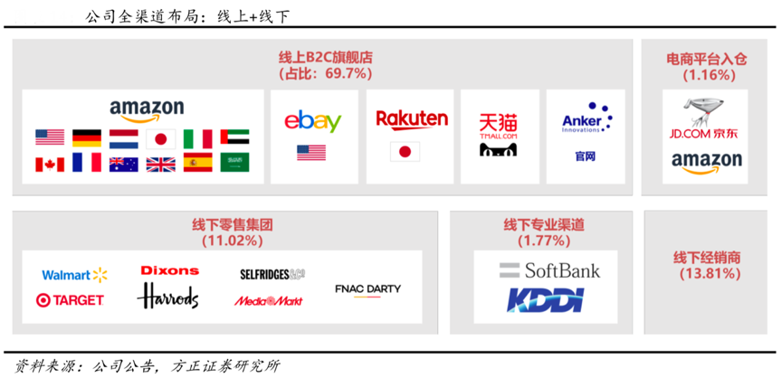 經(jīng)典案例:根據(jù)公司公告、方正證券研究所等綜合資訊表明,“安克創(chuàng)新”以線上市場起步,從亞馬遜優(yōu)先打入歐美市場,2014年入駐美國最大的連鎖超市之一 Staples,開始拓展線下市場。2015年,線下布局中東、澳洲、南美、非洲、東南亞等市場,已成功構(gòu)建線上+線下立體化銷售模式。