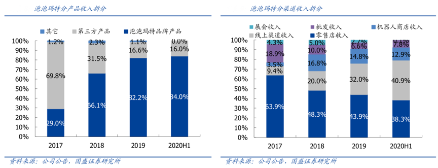 經(jīng)典案例:根據(jù)公司公告、國(guó)盛證券研究所等綜合資訊表明,2019 年,泡泡瑪特品牌產(chǎn)品、第三方產(chǎn)品(手辦、拼圖、潮玩等)、其他業(yè)務(wù)(展會(huì)相關(guān)收入)營(yíng)收占比分別為 82.2%、 16.6%、1.1%,其中品牌產(chǎn)品收入占比提升顯著,而分渠 道來(lái)看,零售店為泡泡瑪特最主要的收入來(lái)源,2019 年占比 43.9%,線上渠道收入占比從 2017 年的9.4%提升至 2019 年的 32.0%,線上渠道收入占比進(jìn)一步增長(zhǎng)成為主要收入來(lái)源(40.9%)。