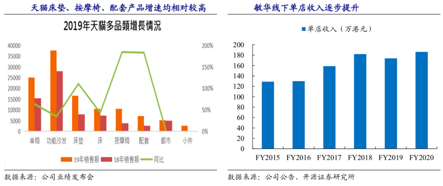 經(jīng)典案例:根據(jù)公司業(yè)績發(fā)布會、公司公告、開源證券研究所等綜合資訊表明,敏華控股品類拓展主要在于依靠沙發(fā)的前端引流作用,逐步帶動床墊、配套等產(chǎn)品銷售,進而提升客單值。2019年,其天貓軟體品類中床墊、按摩椅、配套產(chǎn)品增速均相對較高,而消費升級則主要為伴隨 消費者消費水平的持續(xù)提升,消費者對于芝華士高價系列產(chǎn)品的接受度在不斷提高。