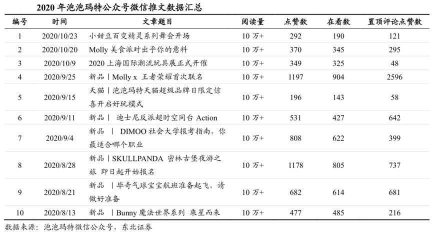 經(jīng)典案例:根據(jù)泡泡瑪特微信公眾號(hào)、東北證券等綜合資訊表明,泡泡瑪特在積極運(yùn)營(yíng)微信公眾號(hào)、微博、抖音等新媒體渠道。其中,抖音粉絲 105 萬(wàn)+,微博粉絲 66 萬(wàn)+,小紅書粉絲14 萬(wàn)+(截至 2020 年 10 月 27 日),尤其是微信公眾號(hào),截至 2020H1,公司官方微信公眾號(hào)擁有 240 萬(wàn)粉絲,文章瀏覽量頻頻 10 萬(wàn)+,點(diǎn)贊數(shù)和在看數(shù)處于較高水平。
