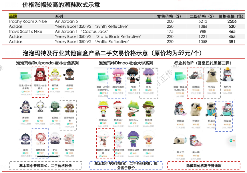 經(jīng)典案例:根據(jù)潮玩族、搜狐、方正證券研究所等綜合資訊表明,泡泡瑪特的產(chǎn)品從設(shè)計(jì)、質(zhì)量、IP知名度等角度較行業(yè)其他產(chǎn)品有一定優(yōu)勢(shì),對(duì)應(yīng)二手交易價(jià)格一般較高,公司通過(guò)定期停售、體系內(nèi) 二手交易(葩趣)等方法維護(hù)較好的二級(jí)市場(chǎng)價(jià)格體系。根據(jù)潮玩族數(shù)據(jù) (19年10月至20年10月),每月交易量TOP50的盲盒產(chǎn)品系列中,泡泡瑪特自有/獨(dú)家IP盲盒產(chǎn)品一般超過(guò)30個(gè),其交易量占總體比例在50%左右,這意味著買(mǎi)泡泡瑪特的盲盒二手折損 較低、交易便利、且部分款式有升值空間。