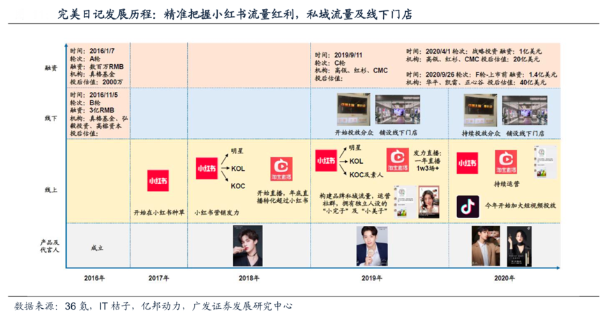經(jīng)典案例:根據(jù)36氪、IT桔子、億邦動(dòng)力、廣發(fā)證券發(fā)展研究中心等綜合資訊表明,完美日記的營(yíng)銷路徑為:(1)前期小紅書密集種草,借助時(shí)尚圈以及粉圈 積累粉絲,通過明星為品牌帶流量;(2)中期小紅書持續(xù)種草,開始發(fā)力直播,同 時(shí)著重私域流量運(yùn)營(yíng);(3)后期持續(xù)運(yùn)營(yíng)小紅書、直播以及社群,開始加快線下門店鋪設(shè),同時(shí)投放分眾樓宇廣告以擴(kuò)大品牌知名度。