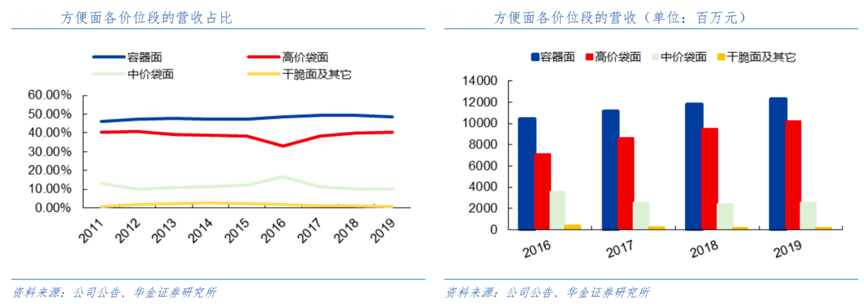 經(jīng)典案例:根據(jù)公司公告、華金證券等綜合資訊表明,截至 2019 年康師傅公司方便面銷(xiāo)售量市占率 43.3%,維持第一的市占率水平。從銷(xiāo)售額方面,公司的方便面銷(xiāo)售達(dá)到 253 億元,在方便面市場(chǎng)的規(guī)模遙遙領(lǐng) 先。其中,高端方便面的營(yíng)收是逐年上升的,其中 2019 年容器面和高價(jià)袋面分別實(shí)現(xiàn)營(yíng)收 123 億元和 102 億元,收入占比提升到 89%。