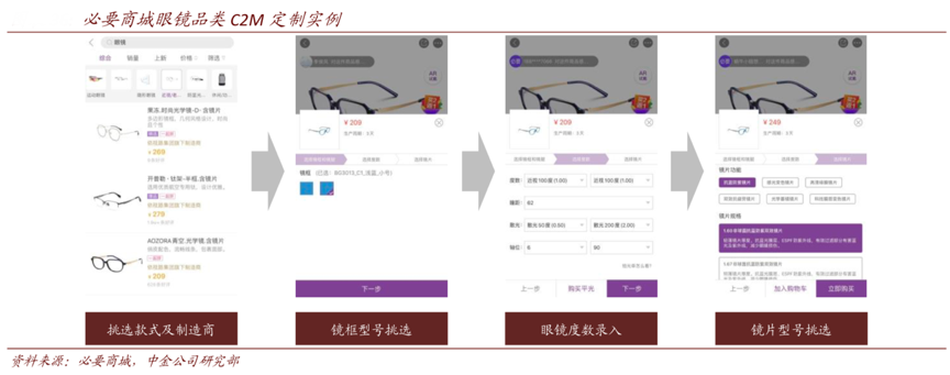 經(jīng)典案例:根據(jù)必要商城、中金公司研究部等綜合資訊表明,客戶在必要商城選擇好鏡片、鏡框并錄入眼鏡度數(shù)后,制造商會 接受訂單進行生產(chǎn)并直接發(fā)貨,一般的生產(chǎn)周期為 3 天,完全繞過了中間環(huán)節(jié)且基本上消除了成品庫存問題。必要認(rèn)為眼鏡這一商品的本質(zhì)不是高端的光學(xué)設(shè)備,而應(yīng)該是日常可選的配飾,并且通過 C2M 對生產(chǎn)價值的鏈的改造,實現(xiàn)了眼鏡的平價化、高性價比化,