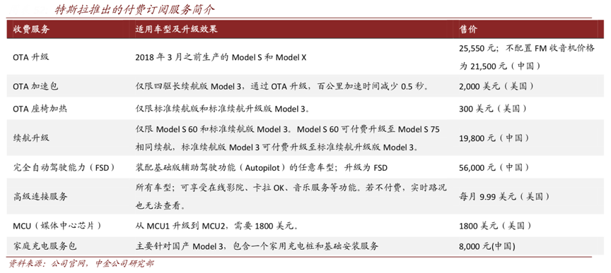 經(jīng)典案例:根據(jù)公司官網(wǎng)、中金公司研究部等綜合資訊表明,特斯拉 2019 年銷量約為 33 萬輛,截至 2019 年全球保有量約 77 萬輛,隨著產(chǎn)銷量不斷爬坡,保有量持續(xù)上漲, 特斯拉推出了一系列付費(fèi)升級及付費(fèi)訂閱服務(wù),收入來源從主要由“新車貢獻(xiàn)”逐漸轉(zhuǎn)向“增量+保有量”共同貢獻(xiàn)。