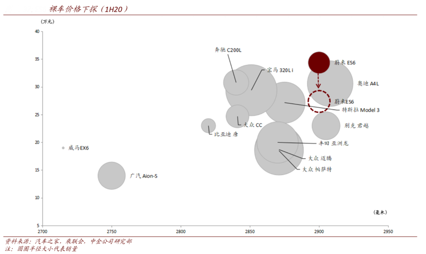 經(jīng)典案例:根據(jù)汽車之家、乘聯(lián)會(huì)、中金公司研究部等綜合資訊表明,蔚來汽車已于 2020 年 8 月推出Baas(Battery as a Service)服務(wù),即消費(fèi)者可以只購買裸車(無電池),后期每月支付一定費(fèi)用以租賃電池,這使得購買價(jià)格直接下降,有利于采購平價(jià)。Baas 方案可使得 ES6 補(bǔ)貼后裸車價(jià)格直接下探至 27.4 萬元,大大提升了產(chǎn)品的市場競爭力。