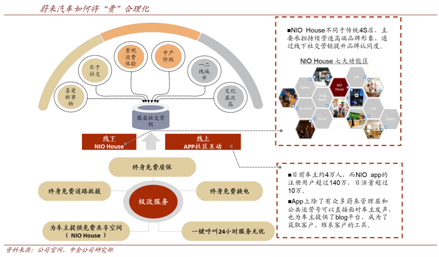 經(jīng)典案例:根據(jù)公司官網(wǎng)、中金公司研究部等綜合資訊表明,蔚來汽車并沒有直接降價(jià)來解決貴的問題,而是通過提供極致服務(wù)、圈層營銷,使“貴”合理化。一方面,蔚來提供全面、極致的售后服 務(wù)體驗(yàn),包括終身免費(fèi)道路救援、終身免費(fèi)質(zhì)保、終身免費(fèi)道路換電、免費(fèi)共享空間等; 另一方面,線下 NIO House 和線上 APP 社區(qū)齊發(fā)力,利用圈層社交營銷,提升品牌認(rèn)可度,塑造高端形象,使“貴”合理化。