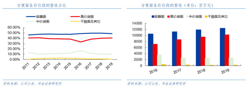 經(jīng)典案例:根據(jù)公司公告、華金證券研究所等綜合資訊表明,截至2019年康師傅方便面銷售量市占率 43.3%,維持第一的市占率水平。從銷售額方面,公司的方便面銷售達(dá)到 253 億元,在方便面市場的規(guī)模遙遙領(lǐng)先。其中,高端方便面的營收是逐年上升的,其中 2019 年容器面和高價(jià)袋面分別實(shí)現(xiàn)營收 123 億元和 102 億元,收入占比提升到 89%;中價(jià)及中低價(jià)方便面的收入占比下降到 11%左右。