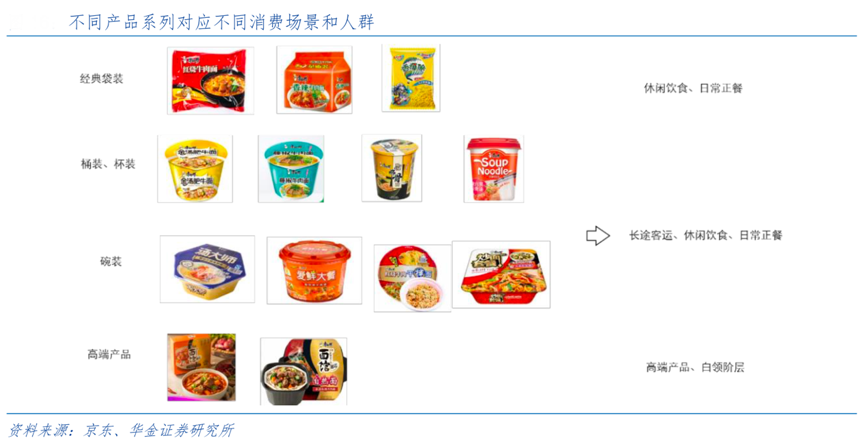 經(jīng)典案例:根據(jù)京東、華金證券研究所等綜合資訊表明,各方便面龍頭廠商通過不斷豐富產(chǎn)品食用方式(泡式、干拌式→煮式和自 熱式)、多樣化產(chǎn)品包裝(袋裝、杯裝、碗裝等)、多樣化的口味(以康師傅為例,方便面有 260 多種不同的口味),橫縱擴(kuò)寬了消費(fèi)場景,從主餐替代、休閑零食到主餐化的發(fā)展,從藍(lán)領(lǐng)到白 領(lǐng),從低收入人群到中高收入人群,從過去的工地、長途路途的充饑場景,到現(xiàn)在辦公室加班、外出游玩、Party 聚會(huì)、游樂園等,隨身攜帶隨時(shí)食用。