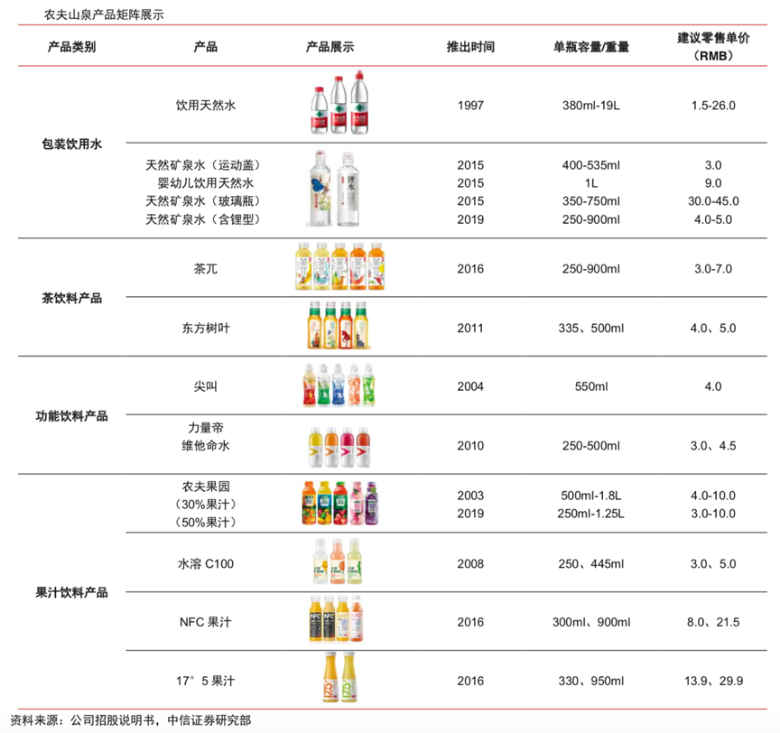經(jīng)典案例:根據(jù)公司招股說明書、中信證券研究部等綜合資訊表明,農(nóng)夫山泉秉承“天然、健康”的品牌理念,以包裝飲用水為基本盤,布局果汁飲料、茶飲料等 多個(gè)飲料賽道,已經(jīng)發(fā)展成為中國包裝飲用水及飲料行業(yè)的龍頭企業(yè)。根據(jù)弗若斯特沙利 文(轉(zhuǎn)引自農(nóng)夫山泉招股書)數(shù)據(jù),2012-2019 年,公司包裝飲用水連續(xù)八年市占率排名第一,茶飲料、功能飲料、果汁飲料市場份額均位于行業(yè)前三名。