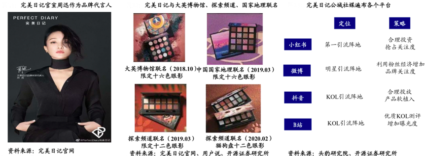 經典案例:根據(jù)完美日記網官網、用戶說、頭豹研究院及開源證券研究所等綜合資訊表明,完美日記的用戶經營極具看點,其于2020年10月官宣周迅作為品牌全球代言人,聯(lián)合李佳琦進行傳播,并先后與大英博物館、Discovery探索頻道、中國國家地理、紐約大都會藝術博物館聯(lián)名,社媒渠道遍布小紅書、微博、抖音、B站等各個平臺,粉絲量行業(yè)領先。截至2020年11月,完美日記的小紅書品牌賬號已擁有194.9萬粉絲,遠超其他知名國貨、外資彩妝品牌。
