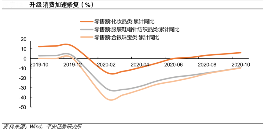 典型數(shù)據(jù):根據(jù)wind、平安證券研究所等綜合資訊表明,耐用消費(fèi)指家電家具等房地產(chǎn)相關(guān)消費(fèi)、汽車、通訊類消費(fèi),對部分有使用需求的消費(fèi)者而言,這類消費(fèi)仍具備必需屬性,消費(fèi)一般只會(huì)延后而不會(huì)消失。在疫情巔峰期后,延后消費(fèi)需求開始涌現(xiàn),相關(guān)需求開始爆發(fā),2020年1-10月累計(jì)同比降幅已大幅收窄,目前繼續(xù)呈現(xiàn)穩(wěn)健修復(fù)的態(tài)勢。