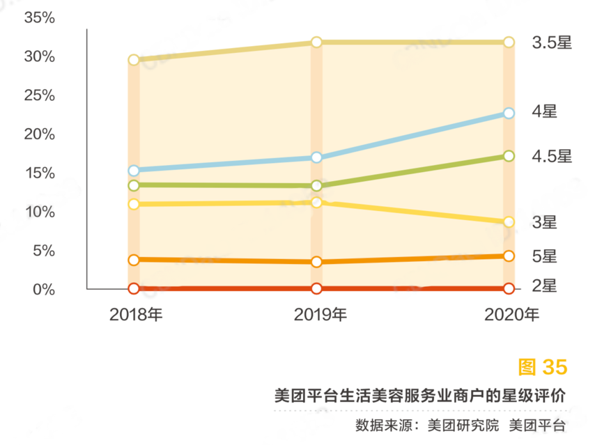 經(jīng)典案例:根據(jù)美團(tuán)平臺(tái)、美團(tuán)研究院等綜合資訊表明,生活美容服務(wù)業(yè)商戶中 4 星、4.5 星、5 星的高星級(jí)商戶占比逐漸上 升,3 星及以下商戶的占比逐漸下降(見圖 35)。分品類來(lái)看,用戶評(píng)價(jià)在 4 星及以上的高 分評(píng)價(jià)商戶中,紋身商戶占比最高,高分評(píng)價(jià)占比達(dá)到 68%。